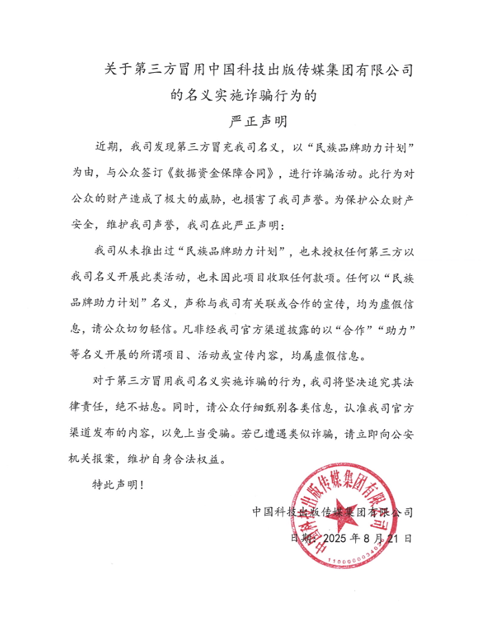 关于第三方冒用中国科技出版传媒集团有限公司的名义实施诈骗行为的严正声明